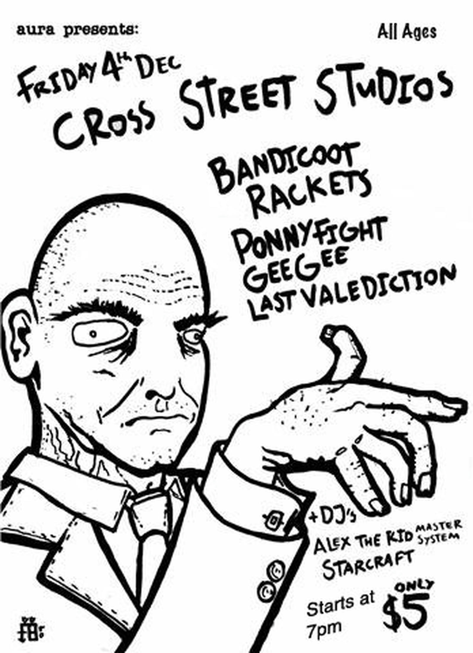 An all-ages gig, presented by Aura, that was headlined by Bandicoot—a local band known for their Post-Punk/Garage Pop sound. Supporting bands included the high-energy, guitar-driven Rackets, Ponnyfight, Gee Gee and Last Valediction, with DJ sets from Alex the Kid and Starcraft.