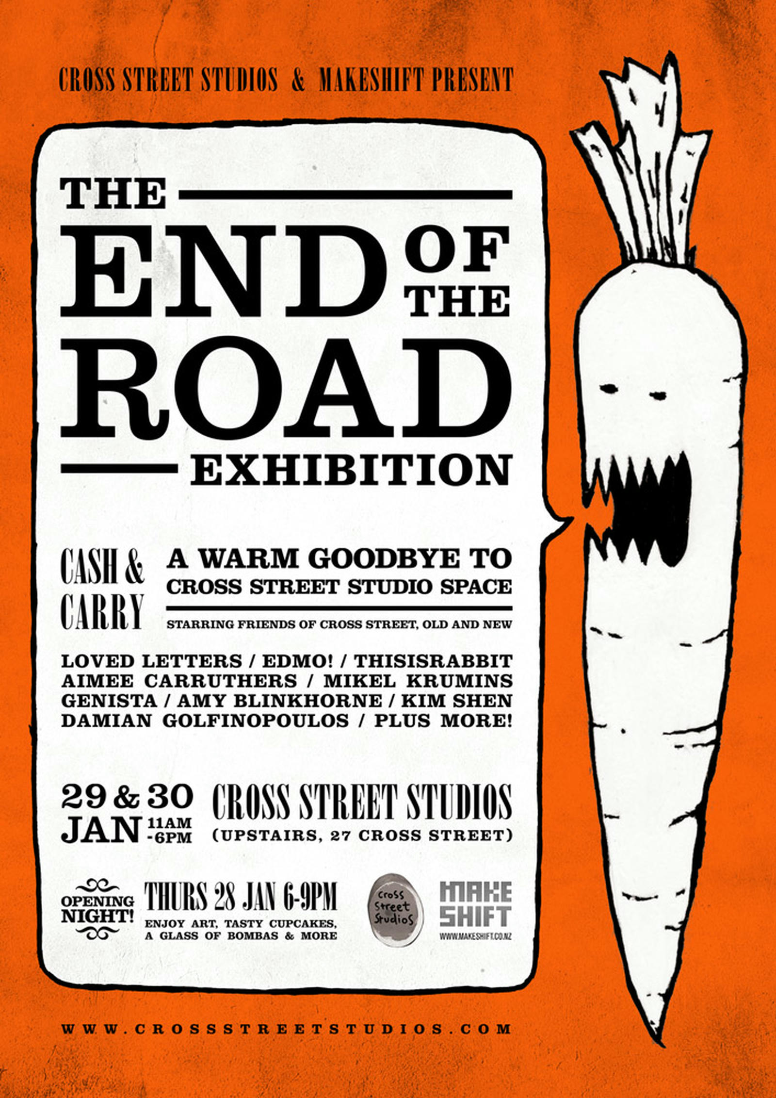 Conceived as a warm goodbye to the space, the three-day event was a fun "cash and carry" exhibition—meaning purchased artwork could be immediately taken home, embodying the spirit that "good things don't just hang around forever." The show featured an eclectic mix of works by resident artists, previous collective members and friends, encompassing pop art, illustration, minimalistic painting, collage and typography. Opening night celebrations were light and cheerful, paying homage to the space's accessible atmosphere with free homemade cupcakes and cheap drinks.