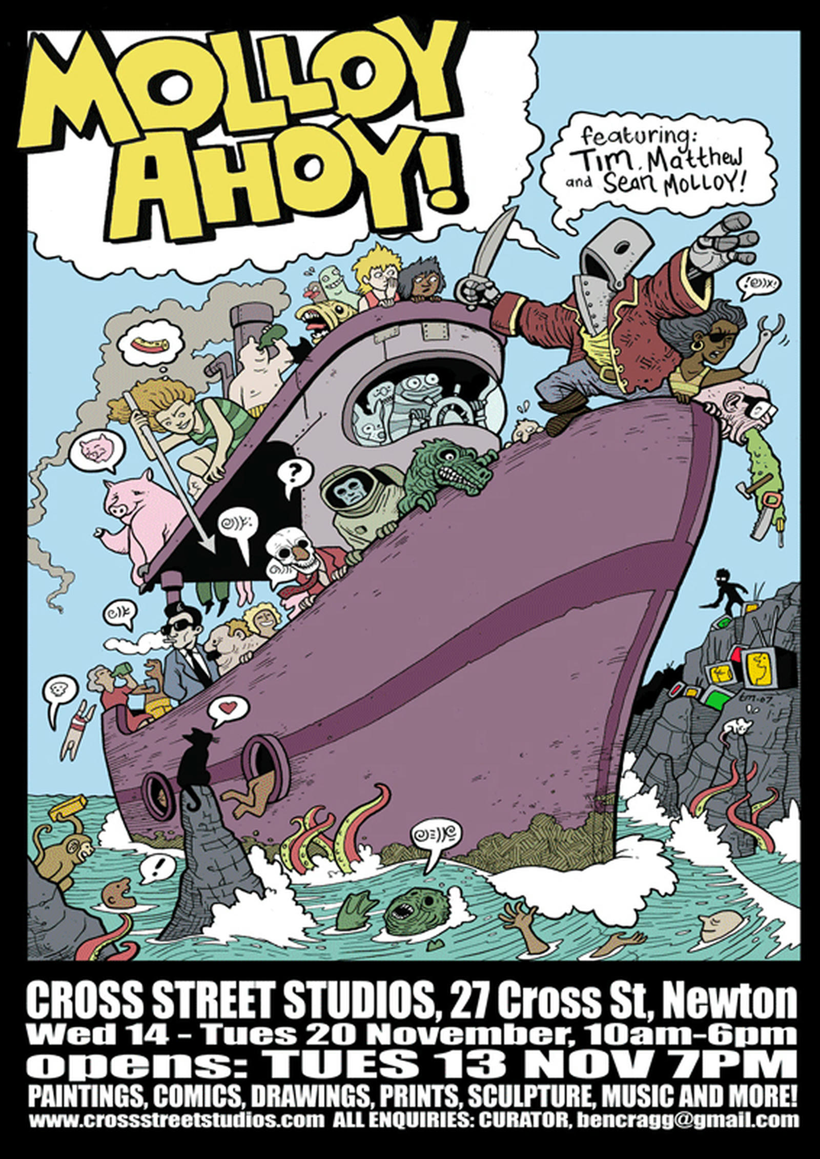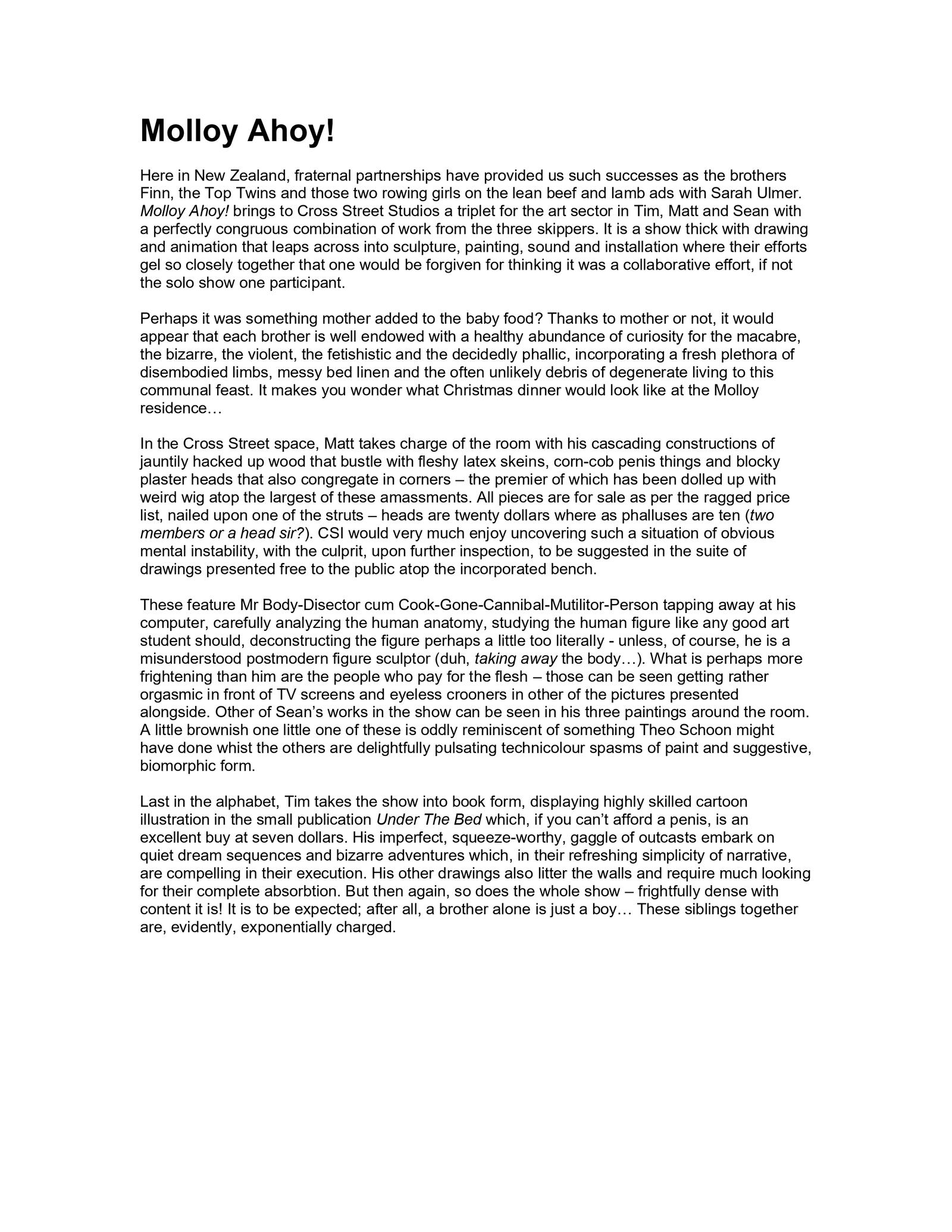 The highly anticipated exhibition Molloy Ahoy! marked the first time the three Molloy brothers had ever shown together. Though they each pursue a distinct artistic path and favour different mediums, Matt, Sean and Tim are united by an interest in the surreal and working outside of traditional fine arts practices.