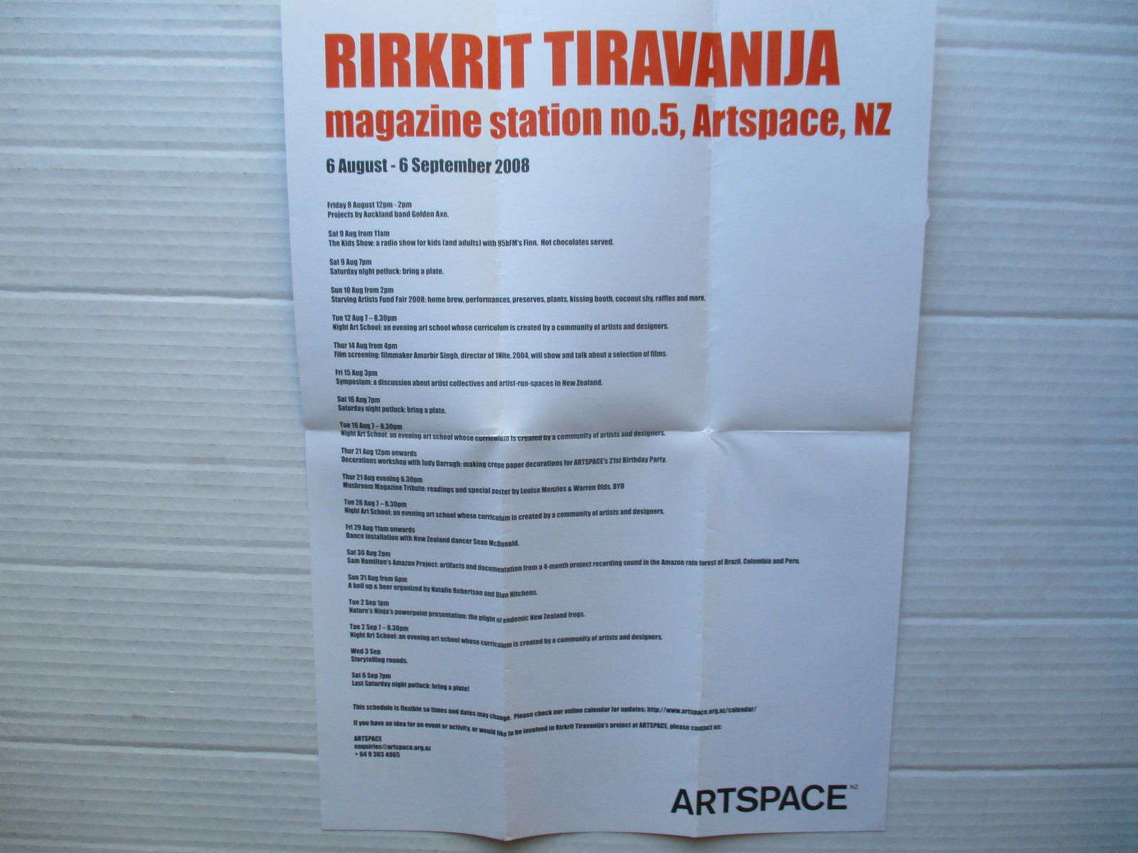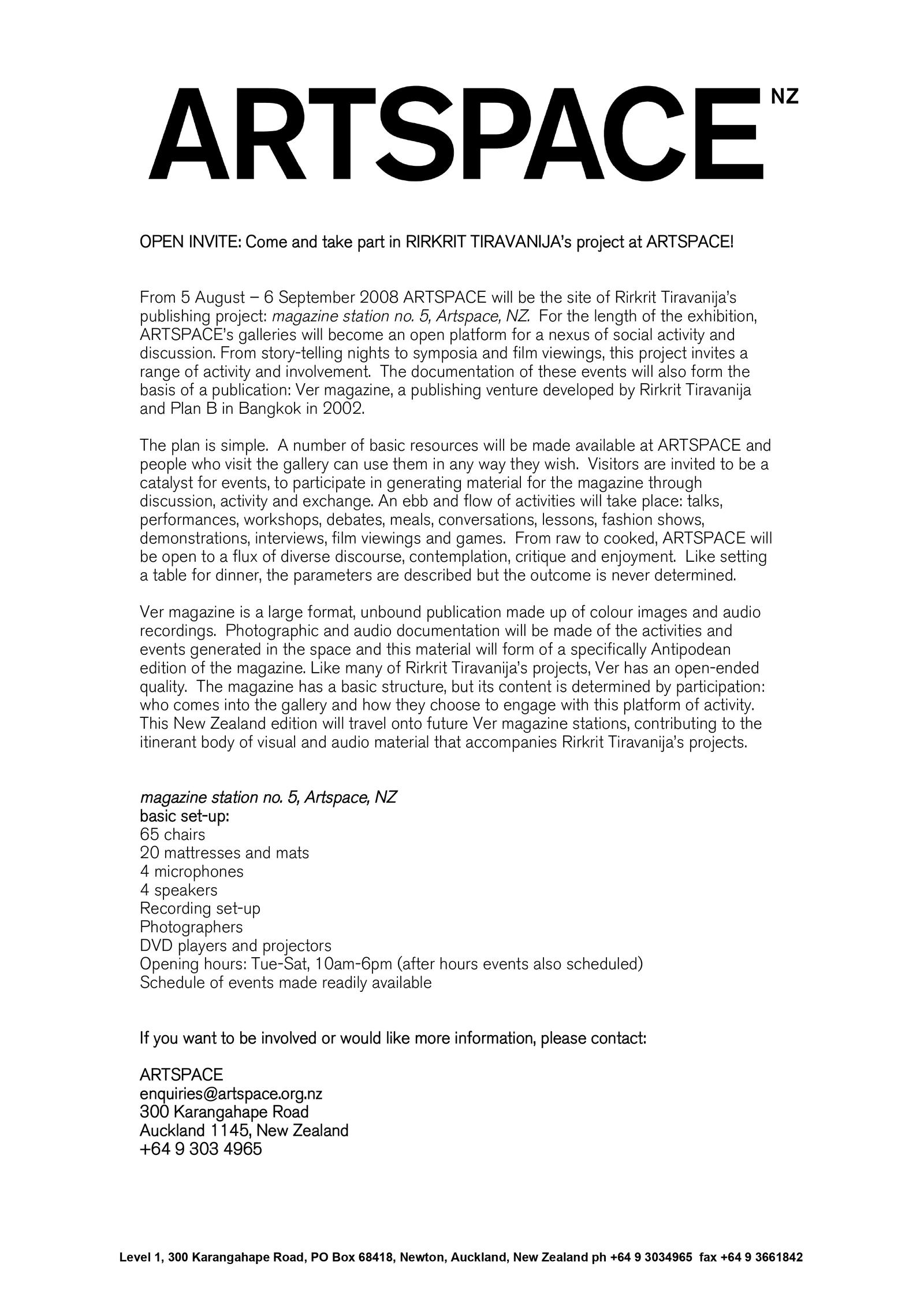 From 6 August–6 September 2008, magazine station no. 5 transformed the gallery into an open platform for social activity, discussion and exchange. Events and interactions in the space were documented to form the basis of an Antipodean edition of Ver magazine, a publishing venture developed by Tiravanija and Plan B in Bangkok in 2002.