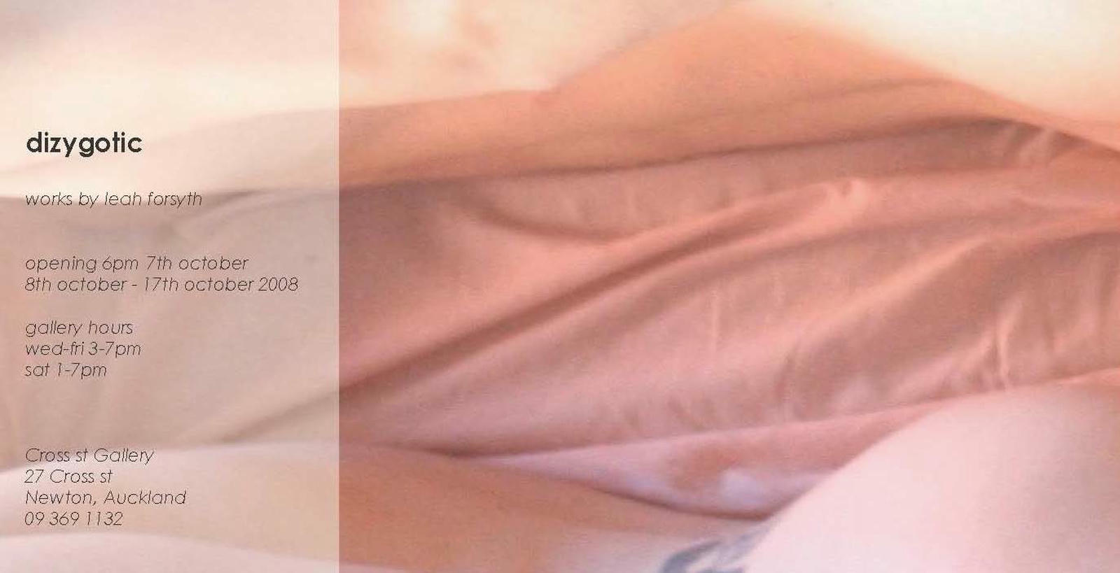 The first solo exhibition by artist Leah Forsyth, Dizygotic featured a series of photographic works exploring the dynamics of her relationship with her twin brother. Using "womb coloured tones and a rough symmetry", Forsyth examined symbols of identity, reflection and individuality.